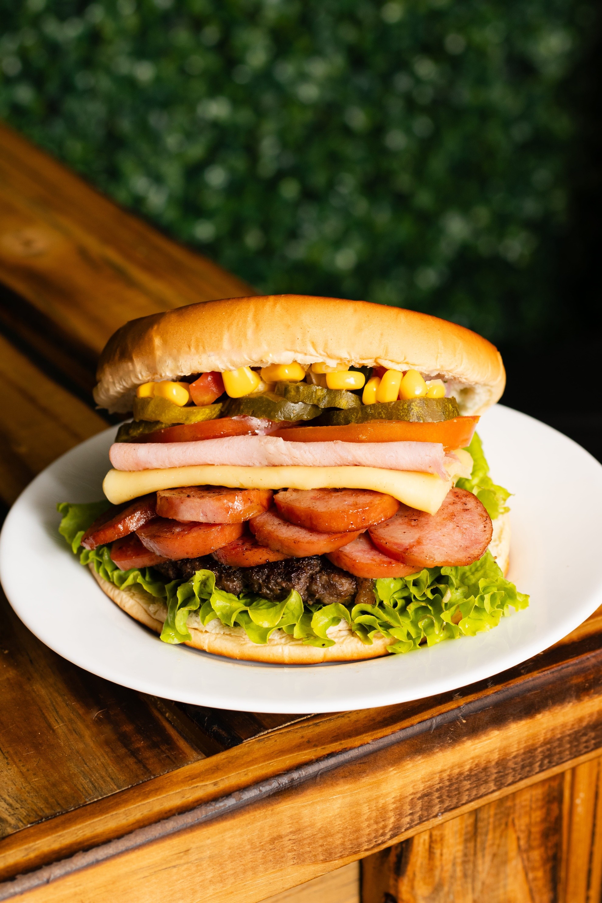 Pão, hambúrguer caseiro, calabresa, queijo, presunto, alface, tomate, pepino, vinagrete, milho