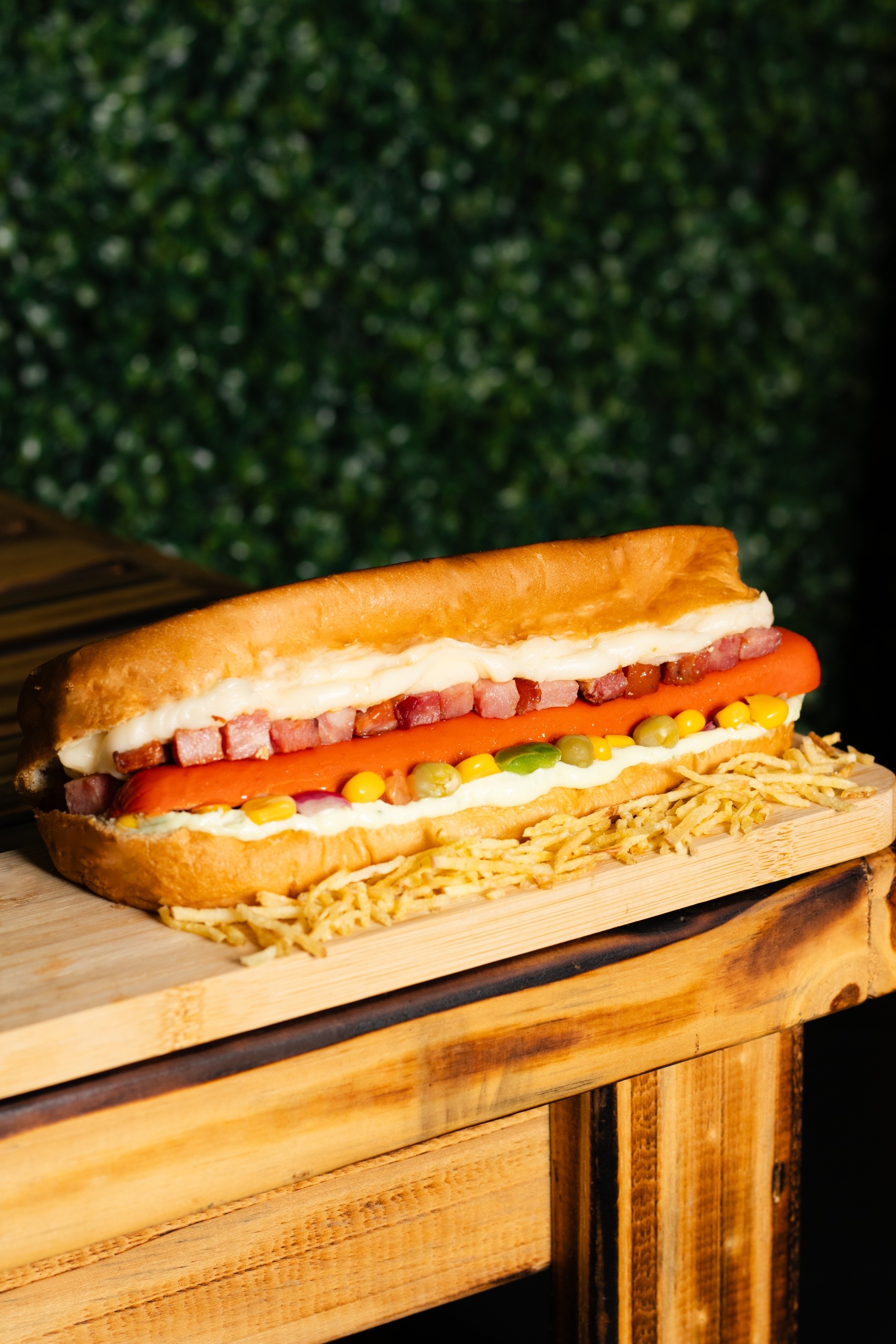 Pão, maionese, molho, catupiry, salsicha, bacon, vinagrete, milho, ervilha e batata palha
