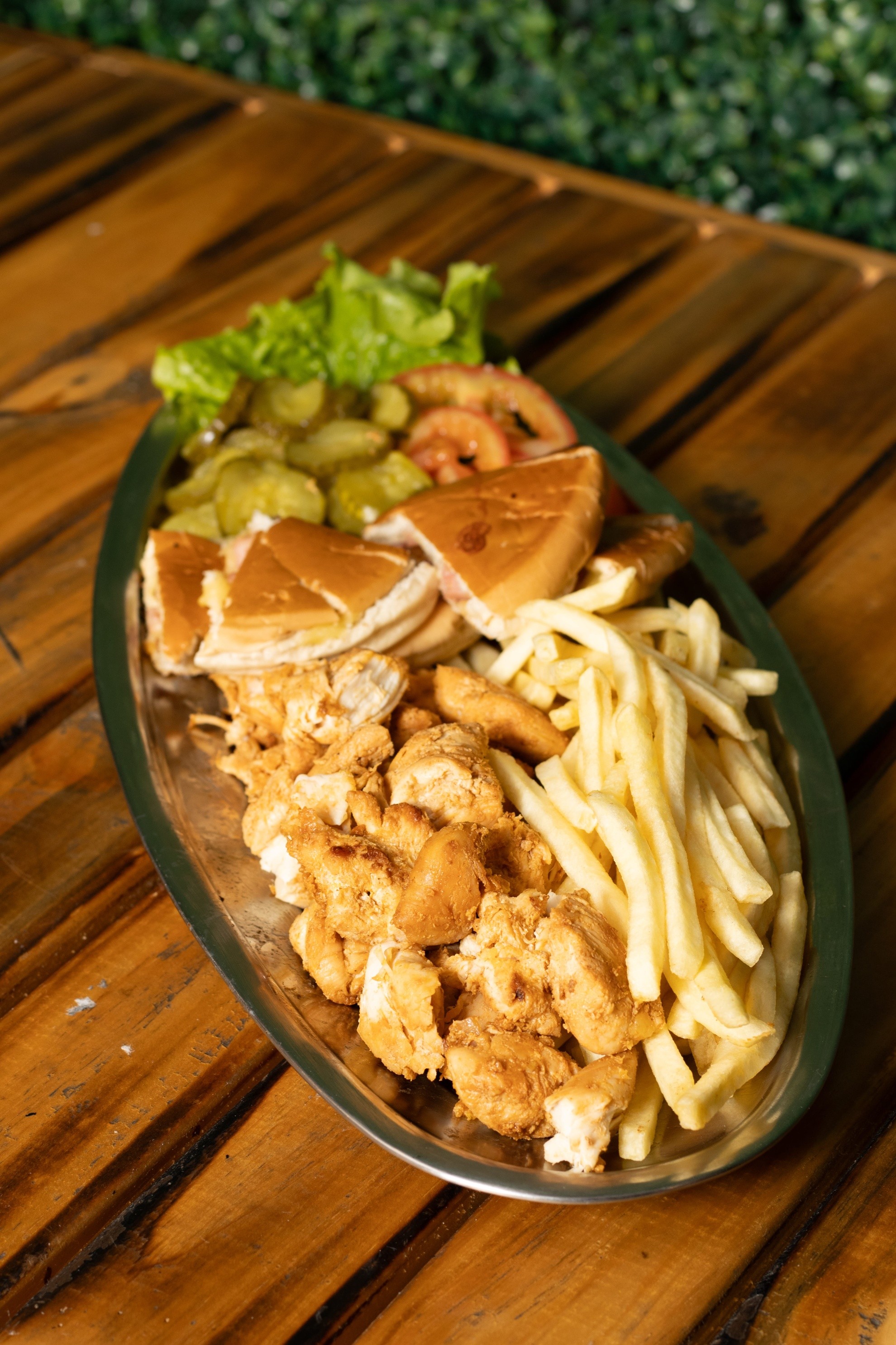 Peito de frango (sassami), torradinha da casa, alface, tomate, pepino e fritas